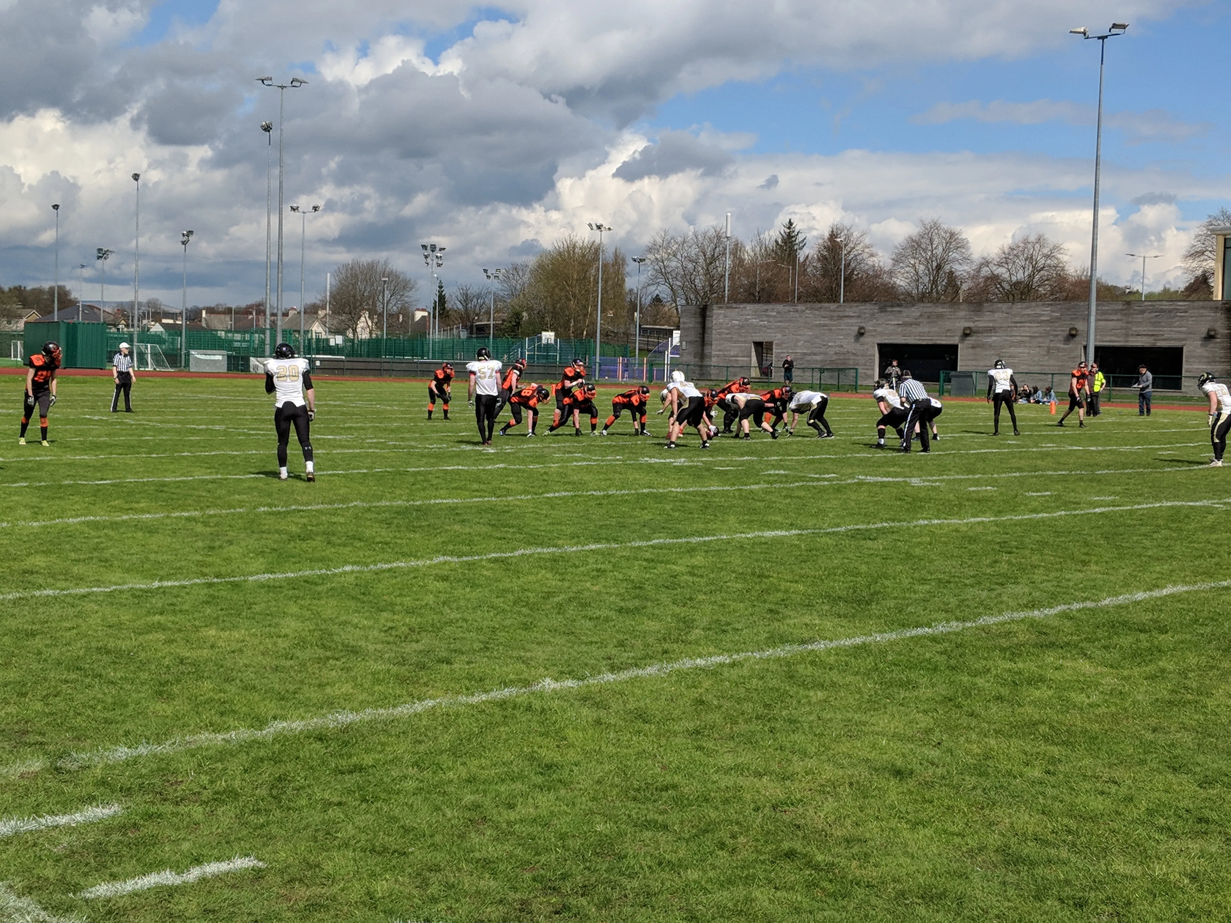 The game kicked off in bright, spring weather as the Rams Offence were given the ball to start the game but couldn’t continue the good form that they showed in the season opener against the Leeds Bobcats. The home side also struggled and after punting the ball back, the Tigers were put under pressure as **Dan Haywood **connected with Christian Davies on a long pass to put the Rams in the redzone, a penalty stopped Chris Peel in his tracks as he looked for a typical short, hard-hitting run to finish the drive but on the next play, Haywood once again connected with Davies who had 3 attempts at securing the ball before holding on and adding 6 points to the scoreboard. A Jeff Quartey PAT attempt was blocked and landed in the arms of Keimar Stuart who turned it into an extra 2 points.